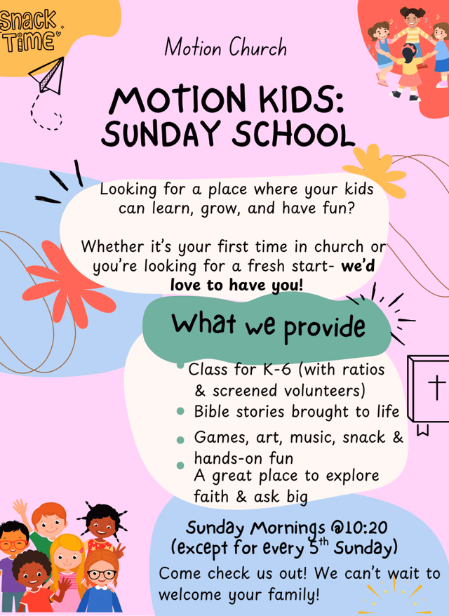 If you have any questions about our Sunday School at Motion, you can email us at info@motionchurch.live or reach out by phone at +1 (343) 297-3978.